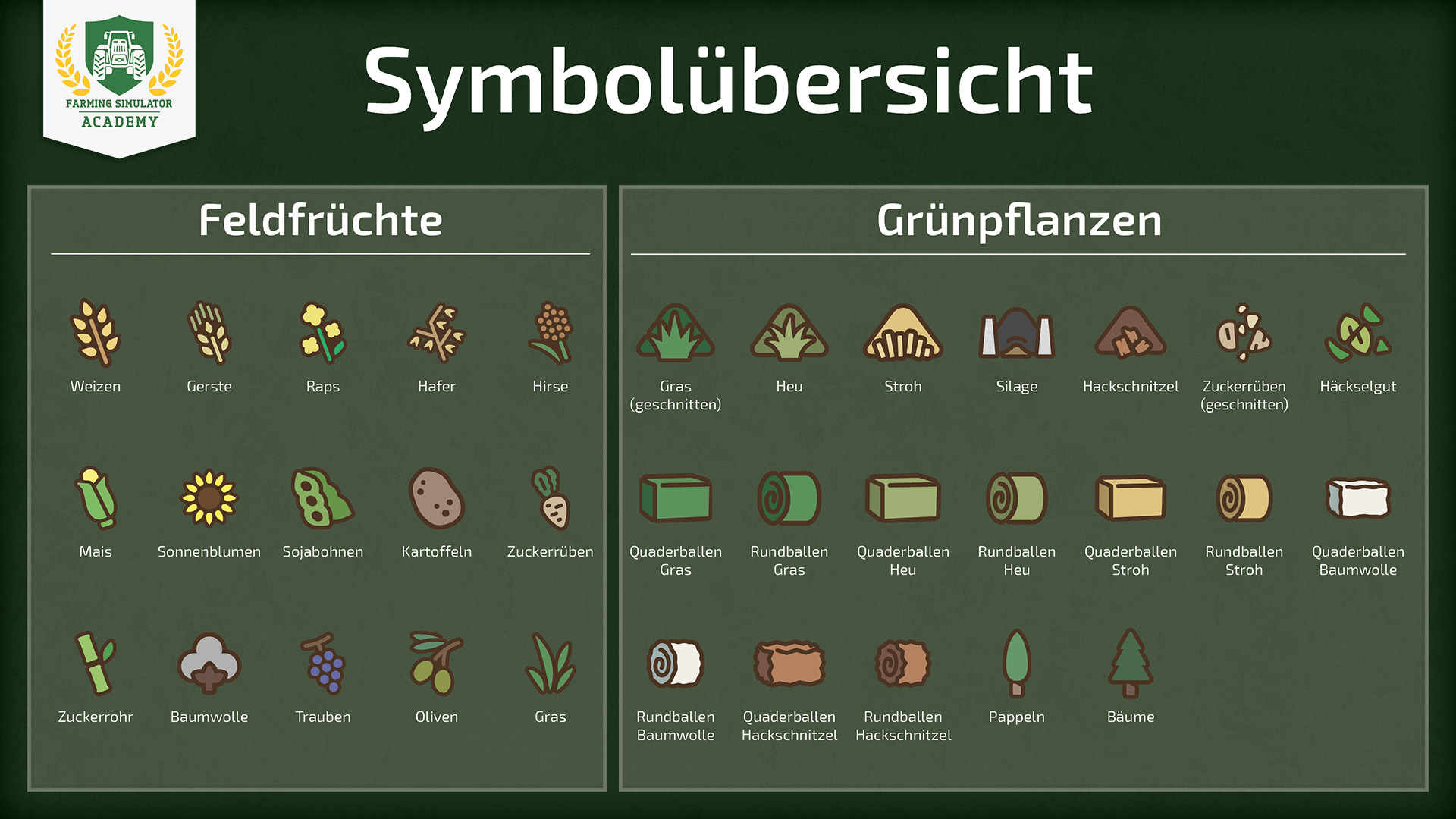 Icons für Feldfrüchte und Grünlandwirtschaft findet ihr fast überall. Sie zeigen an, ob bestimmte Maschinen fähig sind, die jeweilige Feldfrucht zu ernten oder wo sie auf der Map wachsen.
