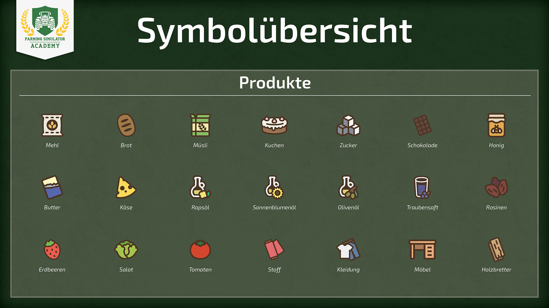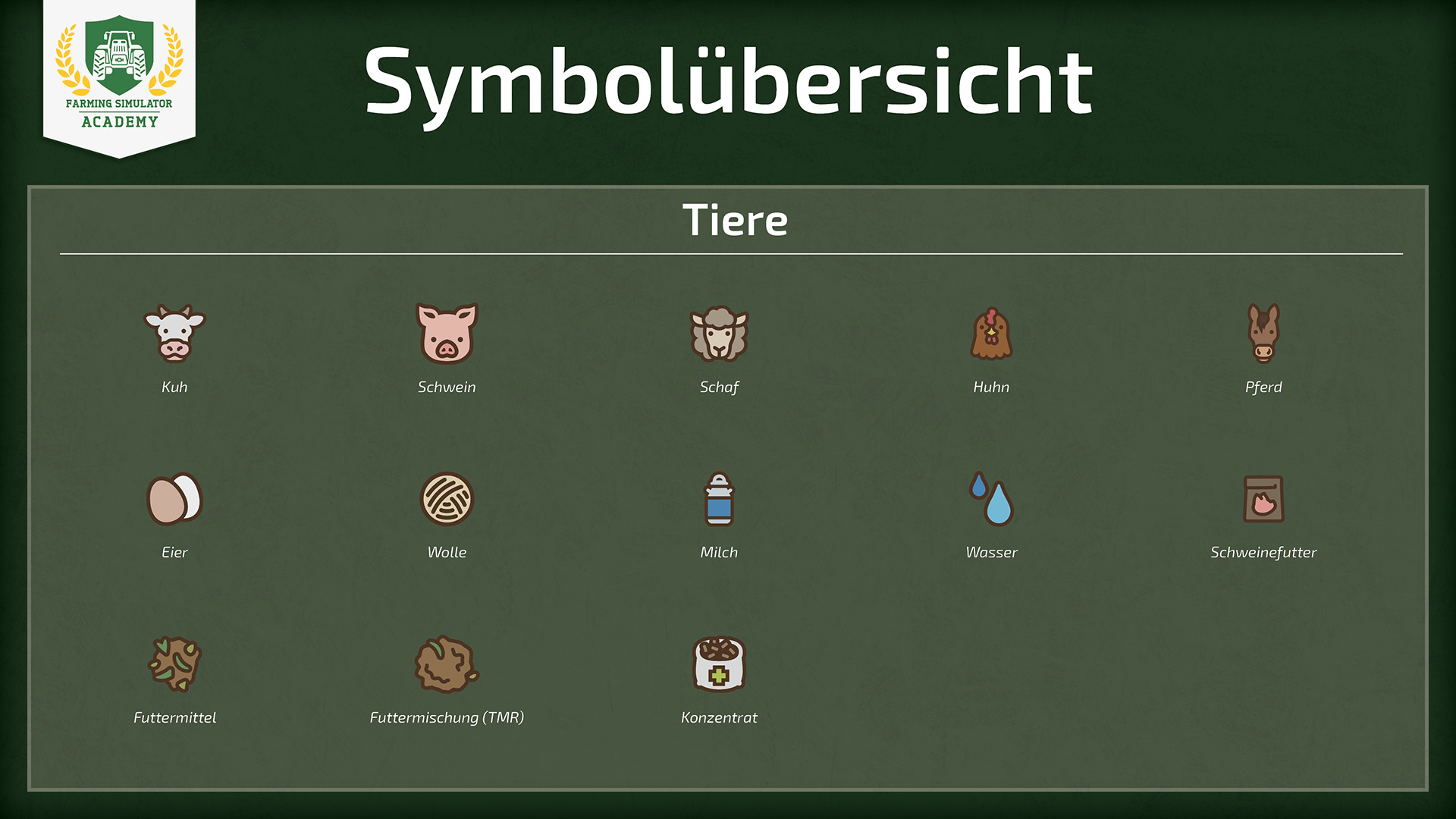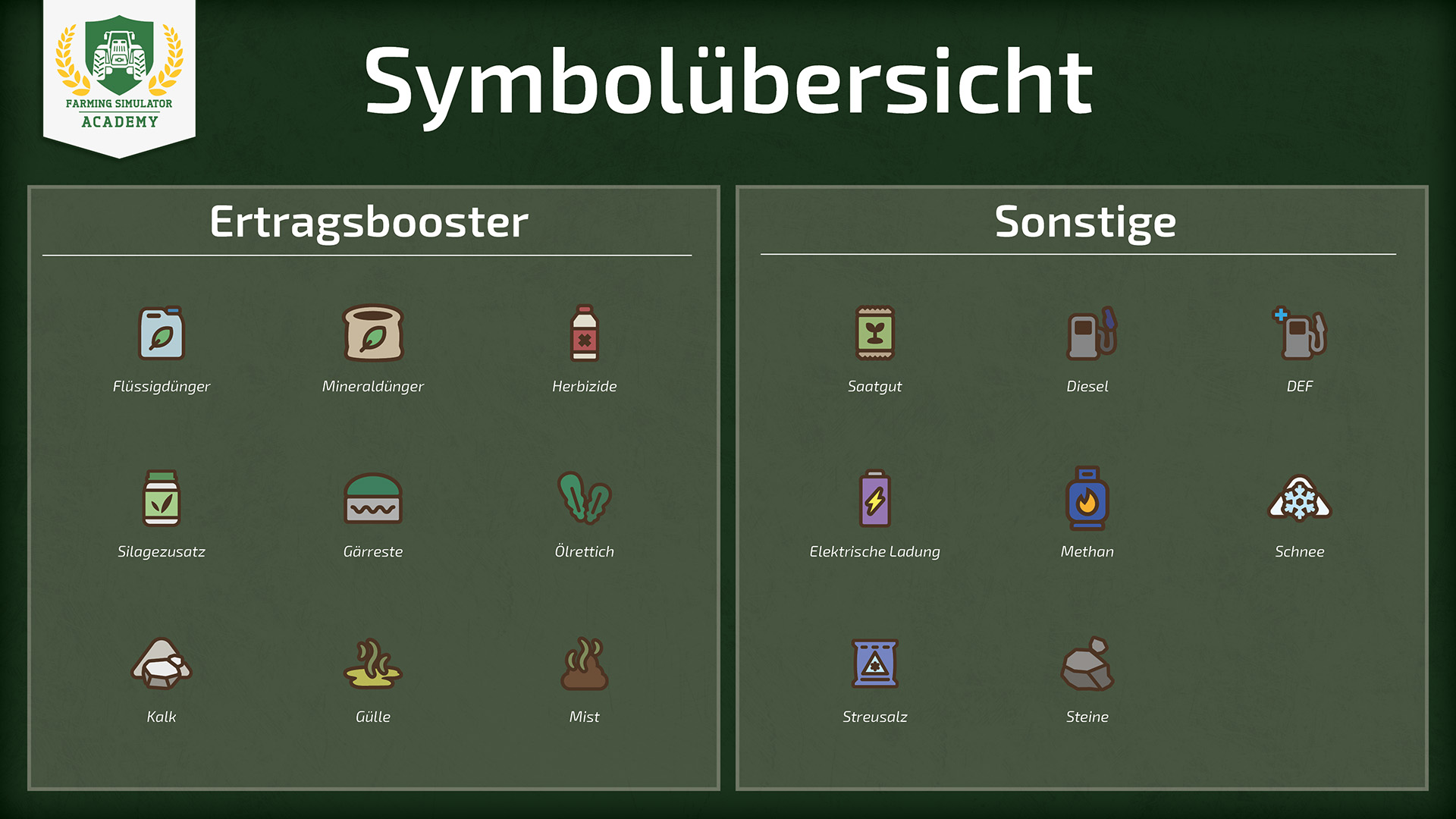 Willkommen in der Farming Simulator Academy. Wir werfen nun einen Blick auf die verschiedenen Icons im Spiel, die euch an verschiedenen Stellen begegnen. Wenn ihr möchtet, könnt ihr die Übersicht auch als druckbare PDF herunterladen.