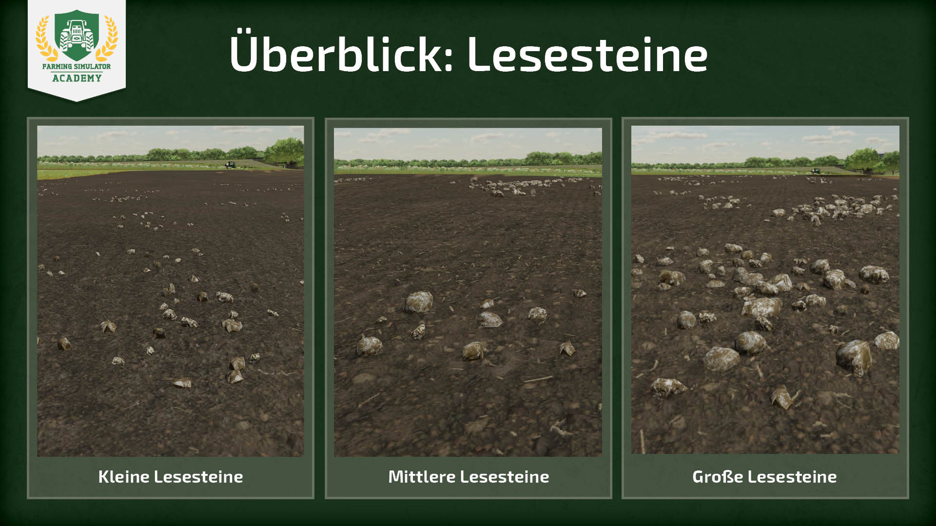 Tipp! Auf der Karte im Menü könnt ihr nach "Bodenbeschaffenheit" filtern. So werden euch auch Steine auf den Feldern angezeigt. Kleine Steine in Gelb, mittlere in Orange und große in Rot.