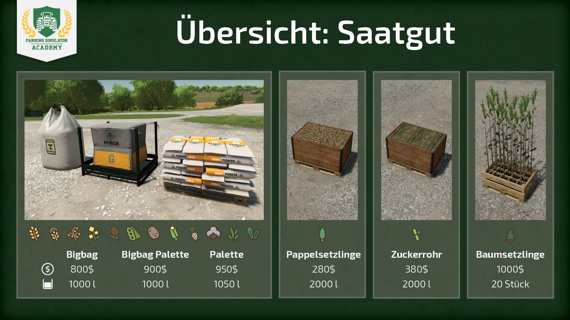 Kauft ihr Saatgut, erhaltet ihr damit auch gleich die Samen für alle Fruchtsorten - mit Ausnahme von Pappeln, Zuckerrohr und Bäumen. Diese findet ihr unter "Paletten" separat. Die Einzelkornsämaschinen bzw. Legemaschinen befüllt ihr auf die gleiche Art.