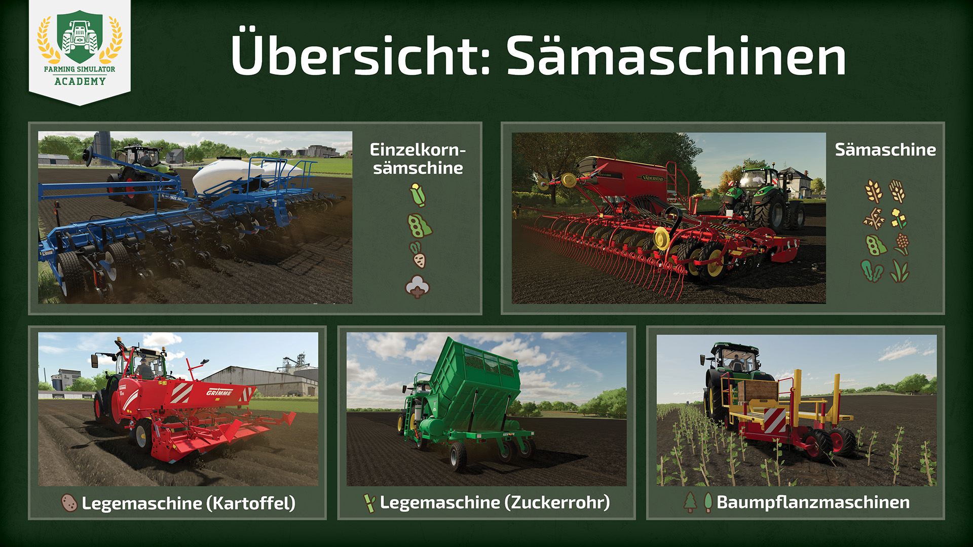 Es gibt verschiedene Maschinen, die ihr zum Säen nutzt. Ihr findet die meisten davon in den Kategorien "Sätechnik" und "Einzelkornsätechnik" des Händlers.