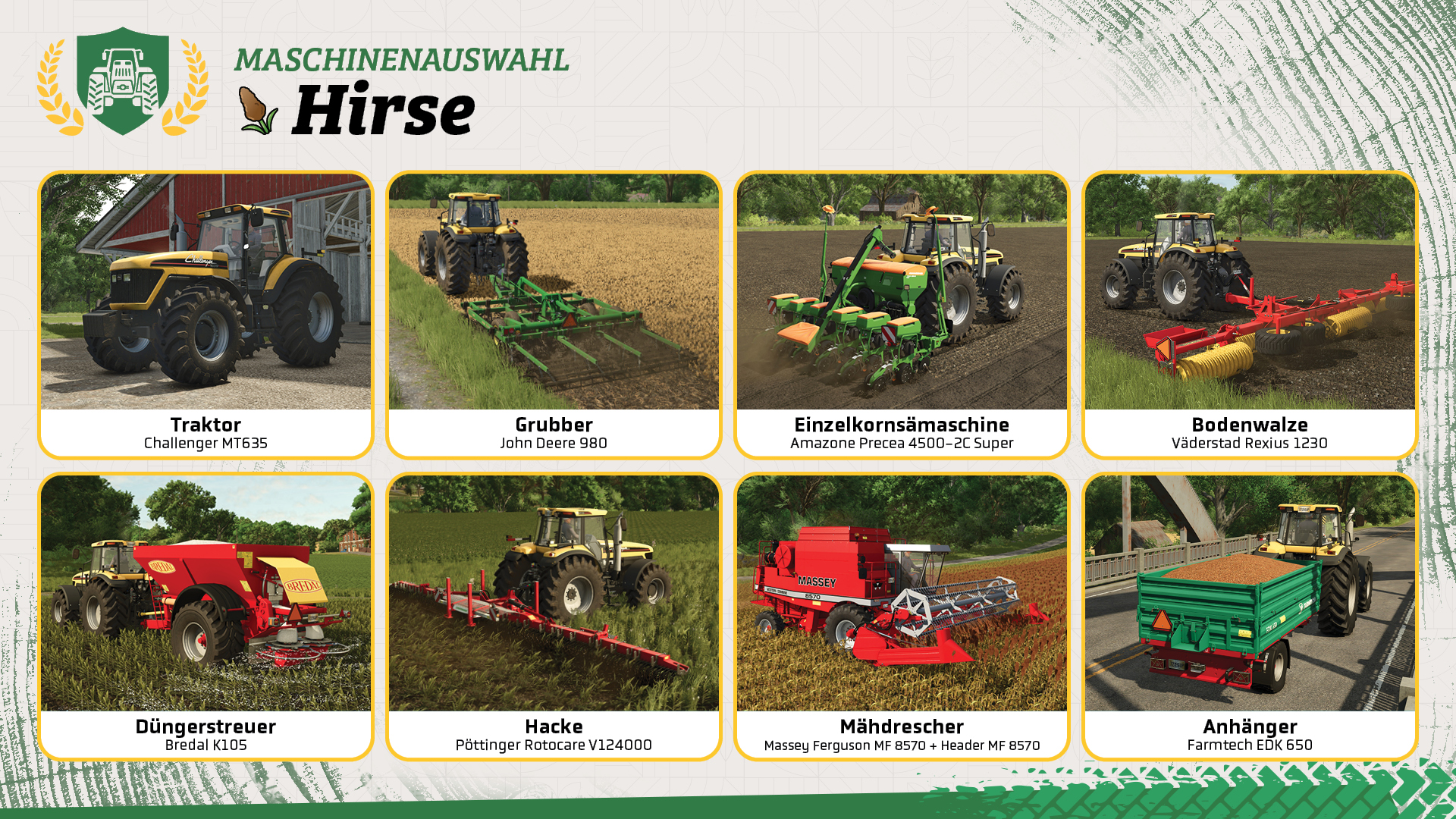 • Ihr benötigt einen Mähdrescher mit passendem Getreideschneidwerk für die Ernte von Hirse.