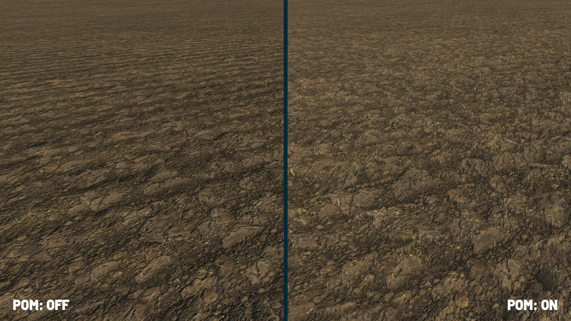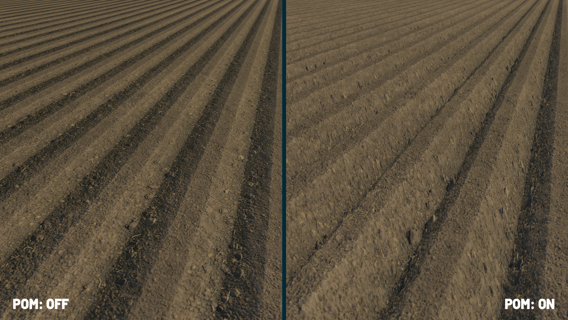 Wir versuchen es, an dieser Stelle möglichst verständlich zu erklären: Parallax Occlusion Mapping ist eine Technik, welche die Details einer Oberflächentextur optimiert und ihnen dabei Tiefe verleiht. Wie zum Beispiel Reifenspuren auf dem Feld, die sich in den Boden graben. Diese Spuren erscheinen dank des neuen Features nun tiefer.